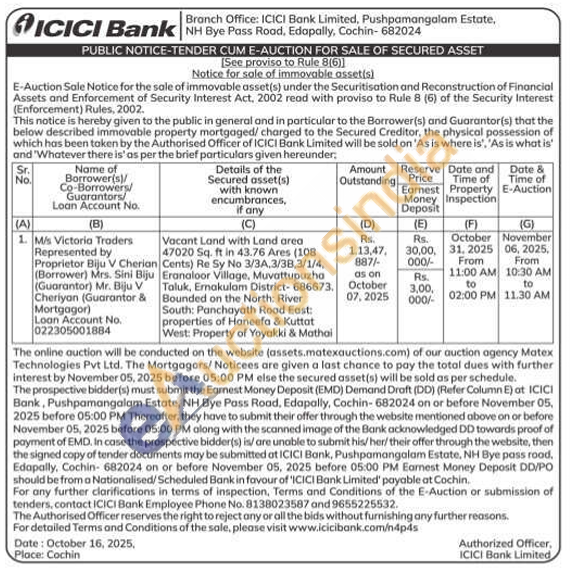 Vacant Land with Land area 47020 Sq. ft in 43.76 Ares (108 Cents) Re Sy No 3/3A,3/38,3/1/4, Eranaloor Village, Muvattupuzha Taluk, Ernakulam District-686673, Bounded on the North: River South: Panchayath Road East: properties of Haneefa & Kuttat West: Property of Yoyakki & Mathal