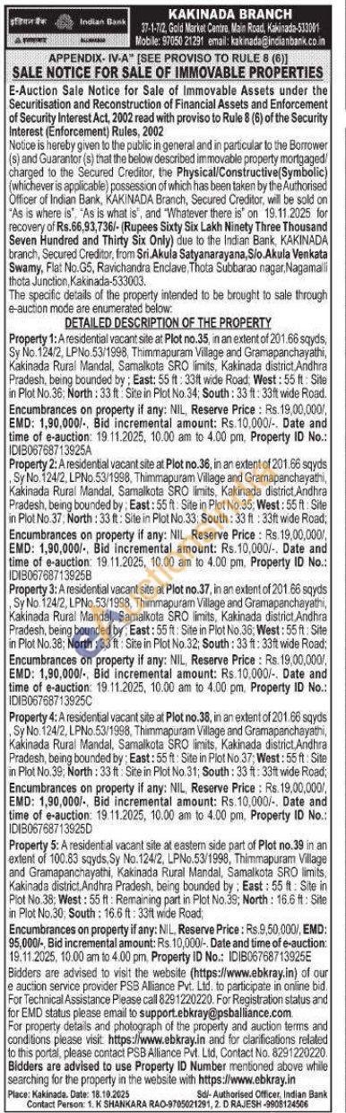 A residential vacant site at Plot no.37, in an extent of 201.66 sqyds Sy No 124/2, LPNo.53/1998, Thimmapuram Village and Gramapanchayathi, Kakinada Rural Mandal, Samalkota SRO limits, Kakinada district, Andhra Pradesh, being bounded by: East: 55 ft: Site in Plot No.36; West: 55 ft: Site in Plot No.38; North: 33 ft: Site in Plot No. 32; South: 33 ft: 33ft wide Road: