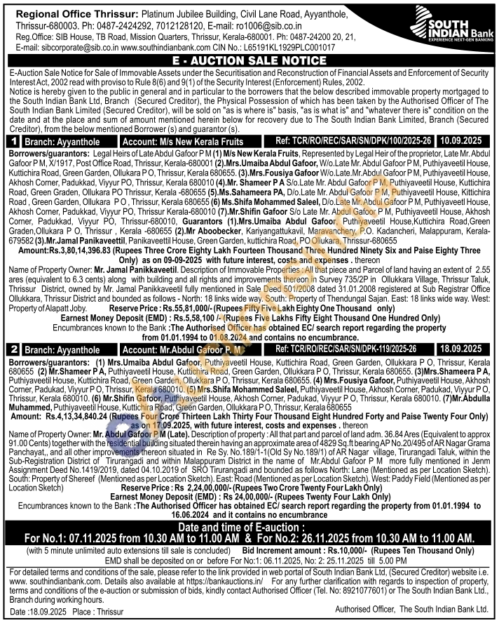 All that piece and Parcel of land having an extent of 2.55 ares (equivalent to 6.3 cents) along with building and all rights and improvements thereon in Survey 735/2P in Ollukkara Village, Thrissur Taluk, Thrissur District, owned by Mr. Jamal Panikkaveetil fully mentioned in Sale Deed 501/2008 dated 31.01.2008 registered at Sub Registrar Office Ollukkara, Thrissur District and bounded as follows - North: 18 links wide way. South: Property of Thendungal Sajan. East: 18 links wide way. West: Property of Alapatt Joby. Reserve Price: Rs.55,81,000/- (Rupees Fifty Five Lakh Eighty One Thousand only)