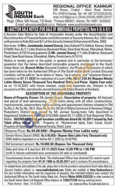 All that part and parcel of land admeasuring 17.30 Cents along with all other constructions, improvements, easementary rights existing and appurtersant thereon situated in Old Sy.No.2,Re. Sy.No. 36/3, New Re.Sy. No.36/3A of Mahe Commune & Revenue Village, Puducherry District and owned by Mr Jameel Sooraj, more fully described in Registered Settlement Deed No.874/2008 dated 03.11.2008 of Sub Registrar Office Mahe. BOUNDARIES as per location certificate dated 06.10.2017 issued by Sub Taluk office Mahe: North Property of Muhammed Iqbal, East: Canal, South: Property of Haseeb and Reshama Farooq, West: Lane