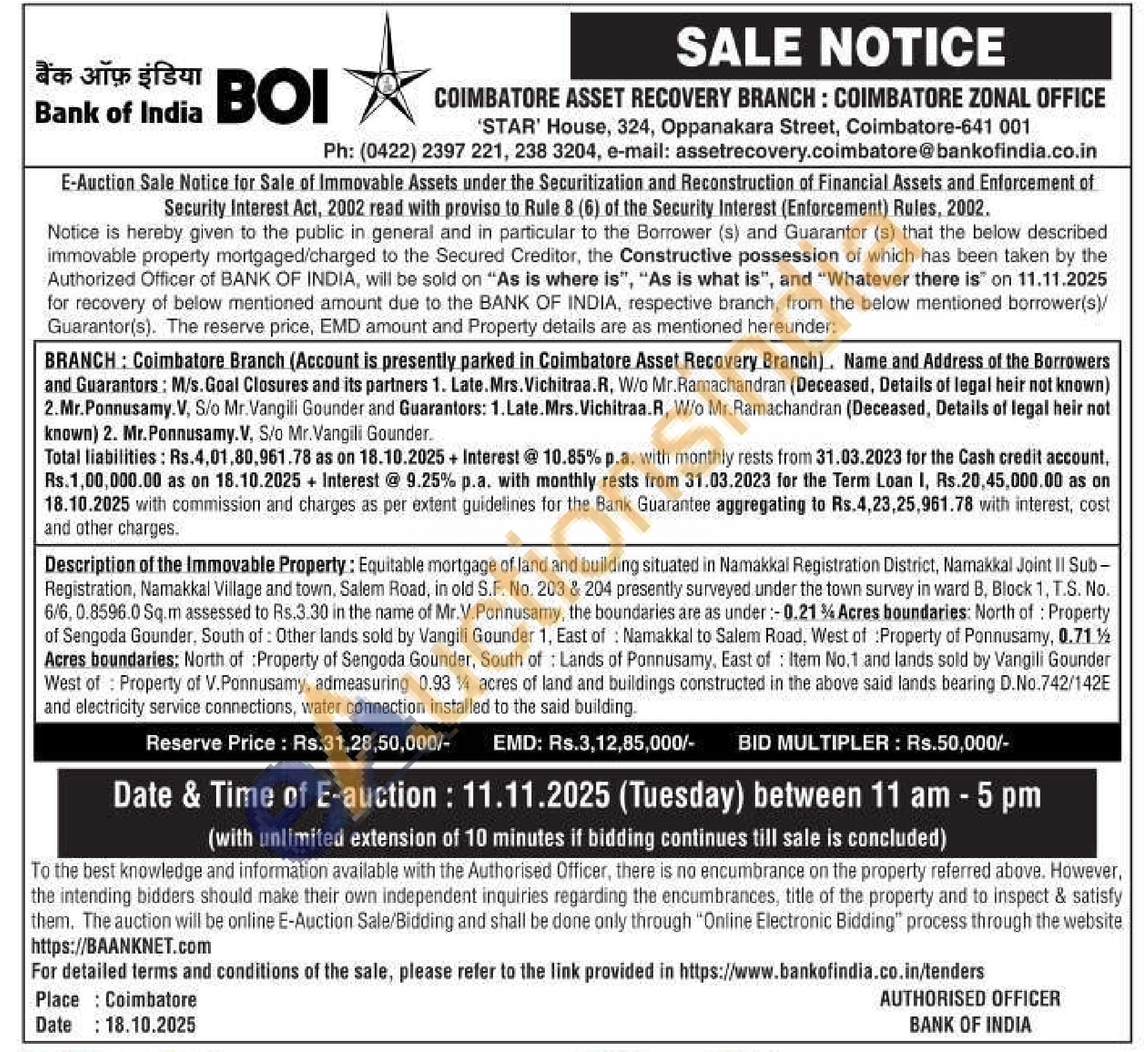 Equitable mortgage of land and building situated in Namakkal Registration District, Namakkal Joint II Sub-Registration, Namakkal Village and town, Salem Road, in old S.F. No. 203 & 204 presently surveyed under the town survey in ward B, Block 1, T.S. No. 6/6, 0.8596.0 Sq.m assessed to Rs.3.30 in the name of Mr.V.Ponnusamy, the boundaries are as under:-0.21% Acres boundaries: North of: Property of Sengoda Gounder, South of: Other lands sold by Vangili Gounder 1, East of: Namakkal to Salem Road, West of Property of Ponnusamy, 0.71.1½ Acres boundaries: North of Property of Sengoda Gounder, South of Lands of Ponnusamy. East of Item No.1 and lands sold by Vangili Gounder West of Property of V.Ponnusamy, admeasuring 0.93 14 acres of land and buildings constructed in the above said lands bearing D.No.742/142E and electricity service connections, water connection installed to the said building