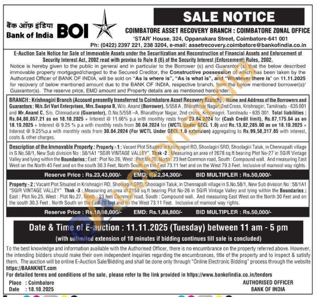 Property-1: Vacant Plot Situated in Krishnagiri RD, Shoolagiri SRD, Shoolagiri Taluk, in Chennapalli village in S.No.58/1, New Sub division No: 58/1A1 "SGIR VINTAGE VALLEY" Thak-2: Measuring an area of 2678 sq.ft bearing Plot No-27 in SGIR Vintage Valley and lying within the Boundaries: East: Plot No.26, West: Plot No.28, North: 23 feet Common road, South: Compound wall. And measuring East West on the North 40 Feet and on the south 30.3 Feet, North South on the East 73.11 feet and on the West 79.3 Feet. Inclusive of mamool way rights