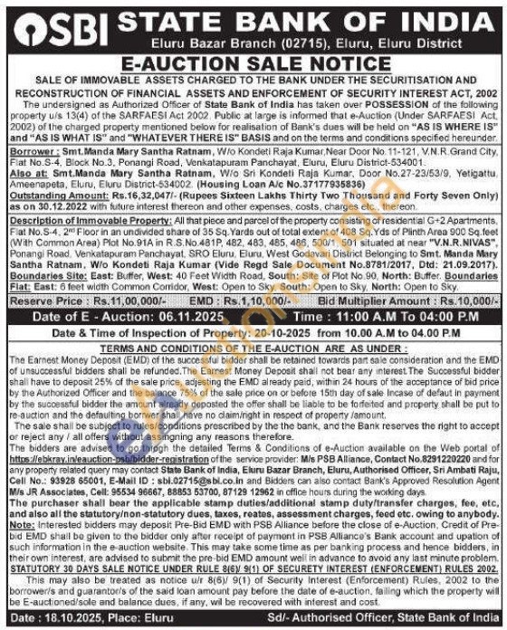 All that piece and parcel of the property consisting of residential G-2 Apartments. Fiat No.S-4, 2 Floor in an undivided share of 35 Sq. Yards out of total extent of 408 Sq. Yds of Plinth Area 900 Sq.feet (With Common Area) Plot No.91A in R.S.No.481P, 482, 483, 485, 486, 500/1, 501 situated at near "V.N.R.NIVAS", Ponangi Road, Venkatapuram Panchayat, SRO Eluru, Eluru, West Godavari District Belonging to Smt. Manda Mary Santha Ratnam, W/o Kondeti Raja Kumar (Vide Regd Sale Document No.8781/2017, Dtd: 21.09.2017). Boundaries Site: East: Buffer, West: 40 Feet Width Road, South: Site of Plot No 90, North: Buffer. Boundaries Flat: East: 6 feet width Common Comidor, West: Open to Sky, South: Open to Sky, North: Open to Sky