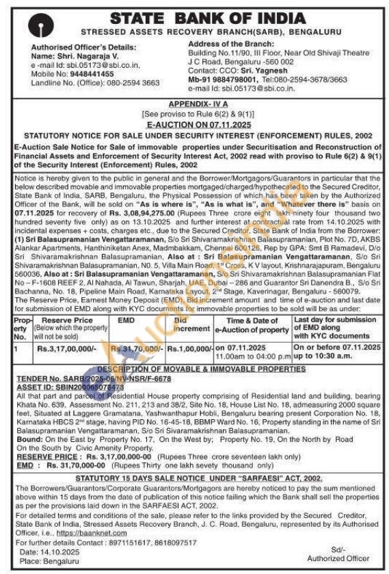 All that part and parcel of Residential House property comprising of Residential land and building, bearing. Khata No. 639, Assessment No. 211, 213 and 38/2, Site No. 18, House List No. 18, admeasuring 2000 square feet, Situated at Laggere Gramatana, Yashwanthapur Hobli, Bengaluru bearing present Corporation No. 18, Karnataka HBCS 2 stage, having PID No. 16-45-18, BBMP Ward No. 16, Property standing in the name of Sri Balasupramanian Vengattaramanan, S/o Sri Sivaramakrishnan Balasupramanian.