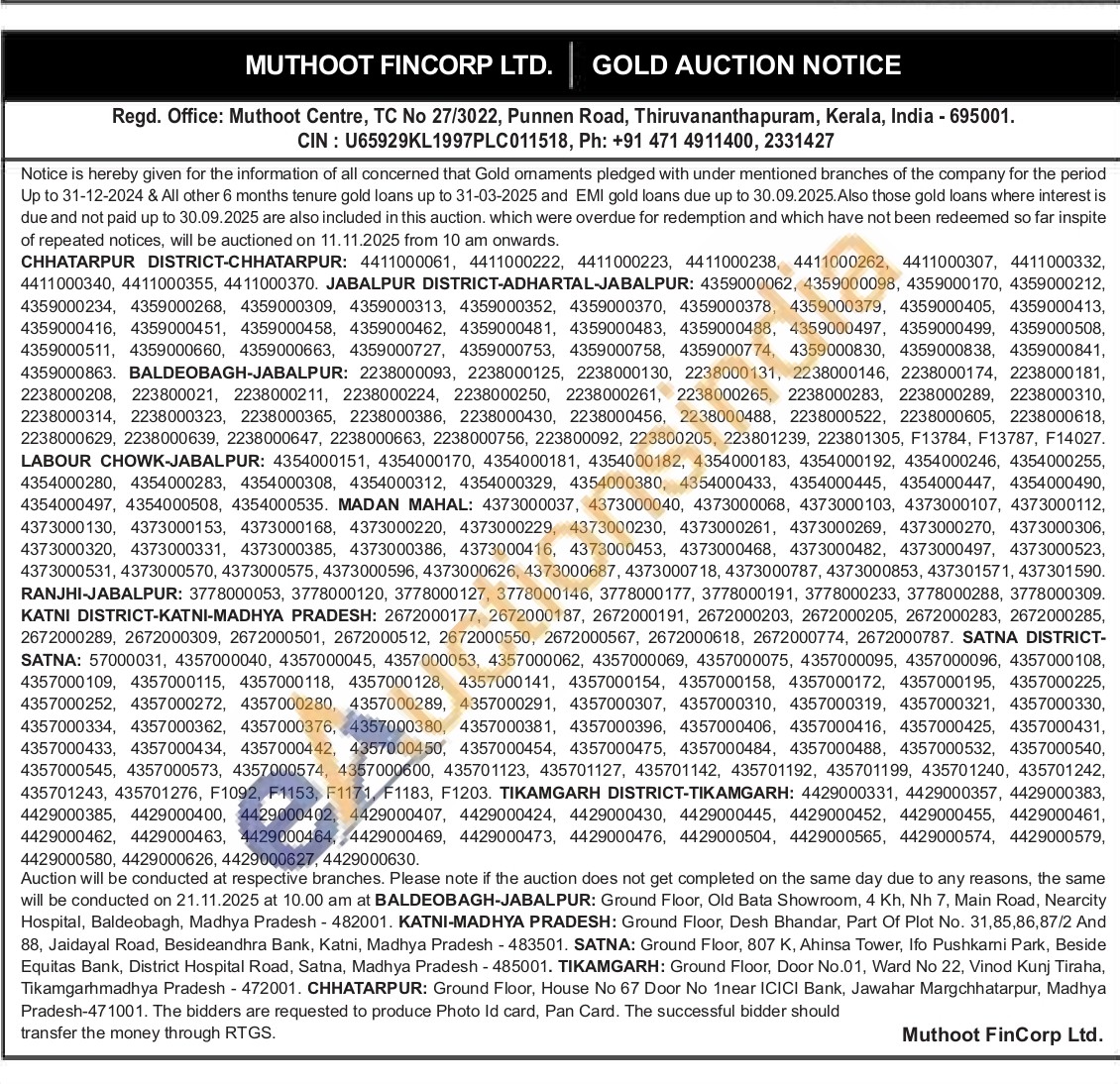 Muthoot Fincorp Ltd Gold Auctions Auction in Jabalpur
