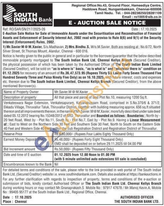 All that piece and parcel of land Plot No.10, measuring 1200 Sq.ft Venkateswara Nagar Extension, Venkatesapuram, Kalyanakuppam Road, comprised in S.No.370/6 & 371/2, Ekkadu Village, Thiruvallur Taluk, Thiruvallur District, together with building measuring approx. 656 sq.ft situated thereon and all improvements thereon, in the name of Mr. Savier.M@M.Xavier, more fully described under sale deed dated 05.12.2012 bearing No. 15348/2012 of SRO, Thiruvallur and Bounded as follows: Boundaries: North by-20 feet Road, West by Plot No.11, South by Plot No.7, East by Plot No.9. Having a Linear Measurement of: East to West on the Northern Side 30 Feet and Southern Side 30 Feet, North to South on the Eastern Side 40 Feet and Western Side 40 Feet, within the Sub Registration District and Registration District of Thiruvallur.