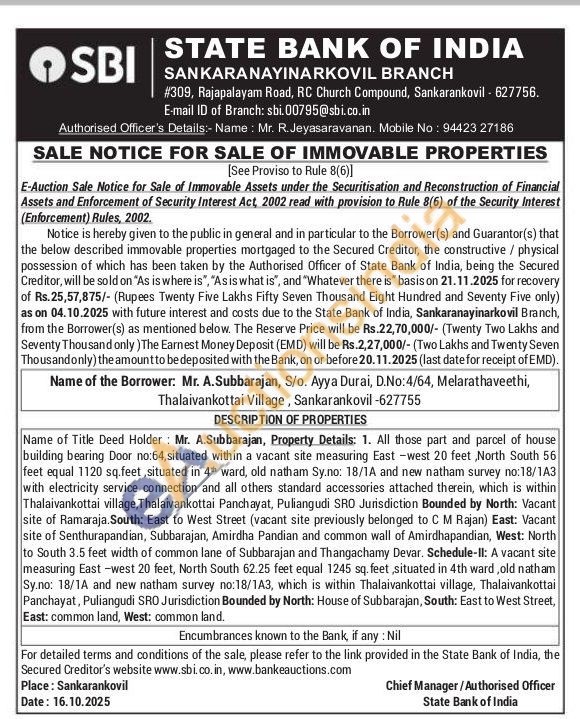 All those part and parcel of house building bearing Door no:64, situated within a vacant site measuring East-west 20 feet North South 56 feet equal 1120 sq.feet, situated in 4th ward, old natham Sy.no: 18/1A and new natham survey no:18/1A3 with electricity service connection and all others standard accessories attached therein, which is within Thalaivankottai village, Thalaivankottai Panchayat, Puliangudi SRO Jurisdiction Bounded by North: Vacant site of Ramaraja. South: East to West Street (vacant site previously belonged to CM Rajan) East: Vacant site of Senthurapandian, Subbarajan, Amirdha Pandian and common wall of Amirdhapandian, West: North to South 3.5 feet width of common lane of Subbarajan and Thangachamy Devar. Schedule-II: A vacant site measuring East-west 20 feet, North South 62.25 feet equal 1245 sq. feet, situated in 4th ward, old natham Sy.no: 18/1A and new natham survey no:18/1A3, which is within Thalaivankottai village, Thalaivankottai Panchayat, Puliangudi SRO Jurisdiction Bounded by North: House of Subbarajan, South: East to West Street, East: common land, West: common land.