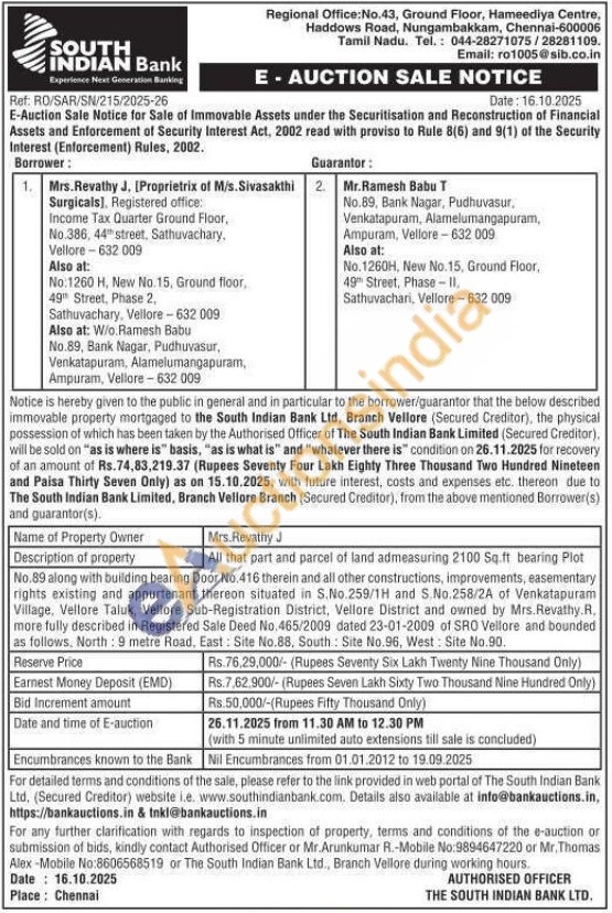 All that part and parcel of land admeasuring 2100 Sq.ft bearing Plot No.89 along with building bearing Door No. 416 therein and all other constructions, improvements, easementary rights existing and appurtenant thereon situated in S.No.259/1H and S.No.258/2A of Venkatapuram Village, Vellore Taluk, Vellore Sub-Registration District, Vellore District and owned by Mrs. Revathy.R. more fully described in Registered Sale Deed No.465/2009 dated 23-01-2009 of SRO Vellore and bounded as follows, North: 9 metre Road, East: Site No.88, South Site No.96, West: Site No.90.