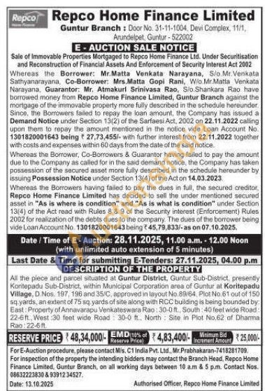 All the piece and parcel situated at Guntur District, Guntur Sub-District, presently Konitepadu Sub-District, within Municipal Corporation area of Guntur al Koritepadu Village, D. Nos. 197, 196 and 35/C, approved in layout No. 89/64. Plot No 61 out of 150 sq. yards, an extent of 75 sq. yards of site along with RCC building is being bounded by East: Property of Annavarapu Venkateswara Rao: 30-0 ft., South: 40 feet wide Road: 22-6ft. West 30 feet wide Road 300 ft. North Site in Plot No.62 of Dharma Rao: 22-6ft