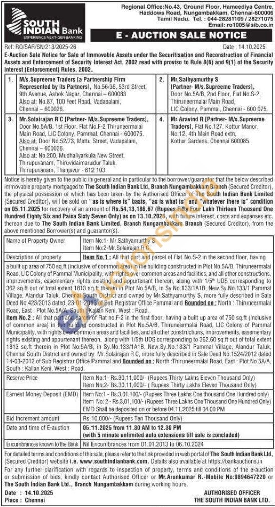 Item No.2: All that part and parcel of Flat no.F-2 in the first floor, having a built up area of 750 sq.ft (inclusive of common area) in the building constructed in Plot No.5A/B, Thiruneermalai Road, LIC Colony of Pammal Municipality, with rights over common areas and facilities, and all other constructions, improvements, easementary rights existing and appurtenant thereon, along with 1/5th UDS corresponding to 362.60 sq.ft out of total extent 1813 sq.ft therein in Plot No.5A/B, in Sy. No.133/1A1B, New. Sy No.133/1 Pammal Village, Alandur Taluk, Chennai South District and owned by Mr.Solairajan R C, more fully described in Sale Deed No. 1524/2012 dated 14-03-2012 of Sub Registrar Office Pammal and Bounded on: North: Thiruneermalai Road, East: Plot No.5A/A South Kallan Keni, West: Road.