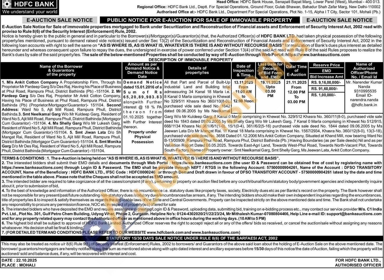 All That Part And Parcel of Built-Up Industrial Land and Building total admeasuring 34 Kanal 18 Maria i.e. 8 Kanal 0 Marla comprising in Khewat No 329/511 Khasra No 360//10(8-0), 8 Kanal 0 Marla comprising in Khewat No. 329/512 Khasra No. 360//11(8-0), purchased vide sale deed No 1843 dated 09.06.2005 by Ms Shelly Garg W/o Mr Lukesh Garg. 7 Kanal 0 Marla comprising in Khewat No 512/915, 668/1134 Khasra No 361//6/1(1-0), 15/1(0-4), 361//6/2(5-16) purchased vide sale deed No. 1844 dated 09.06.2005 by Ms Jeewan Lata Dio Mr Mangat Rai. 11 Kanal 18 Marla comprising in Khewat No. 1567/2934, Khasra No. 360//12(8-0), 13(3-18), purchased vide sale deed No. 3656 Dated 01.12.2006 M/s Ankit Cotton Company, Situated at Khand Mill, now bearing Ward No B-13/00909, Rampura Phul Road, Rampura Phul, District Bathinda (Pb.) Having Boundaries (as per Sale deeds) Nil and as per Valuation Report Dated 06.05.2025. Towards East-Agri Land, Towards West-Phul Road, Towards North-Vacant Plot, Towards South-Factory. Name of Property owner: Smt Neelkamal Garg, Smt Shelly Garg, Ms Jeewan Lata, Ankit Cotton Company.