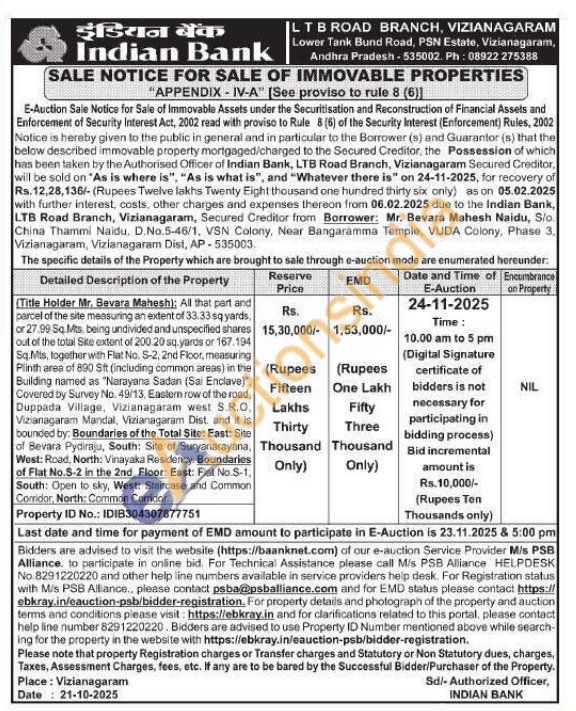 All that part and parcel of the site measuring an extent of 33.33 sq yards, or 27.99 Sq.Mts. being undivided and unspecified shares out of the total Site extent of 200.20 sq. yards or 167.194 Sq.Mts, together with Flat No. S-2, 2nd Floor, measuring Plinth area of 890 Sit (including common areas) in the Building named as "Narayana Sadan (Sai Enclave)". Covered by Survey No. 49/13, Eastern row of the road, Duppada Village, Vizianagaram west S.R.O. Vizianagaram Mandal, Vizianagaram Dist. and it is bounded by: Boundaries of the Total Site: East: Site of Bevara Pydiraju, South: Site of Suryanarayana, West: Road, North: Vinayaka Residency Boundaries of Flat No.S-2 in the 2nd Floor: East: Flat No.S-1, South: Open to sky, West: Staircase and Common Corridor, North: Common Comidor