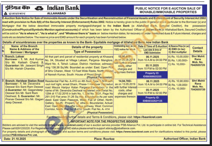 1) All that part and parcel of residential property at Khasara No. 04, Situated at Village Laksari, Pargana- Manglore, Ward No. 4, Tehsil- Laksar, District- Haridwar, admeasu -ring 138.38 Sq.Mtr. Bounded as under: East: Open Plot of Shiv Charan, West: 13 Feet Wide Rasta, North: House of Naresh Kumar, South: House of Phool Singh