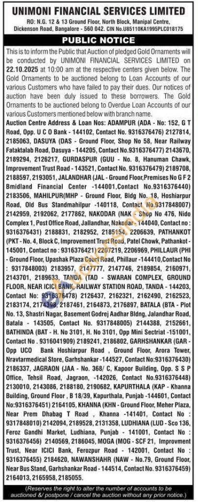 Unimoni Financial Services Limited Gold Auctions Auction in Bengaluru
