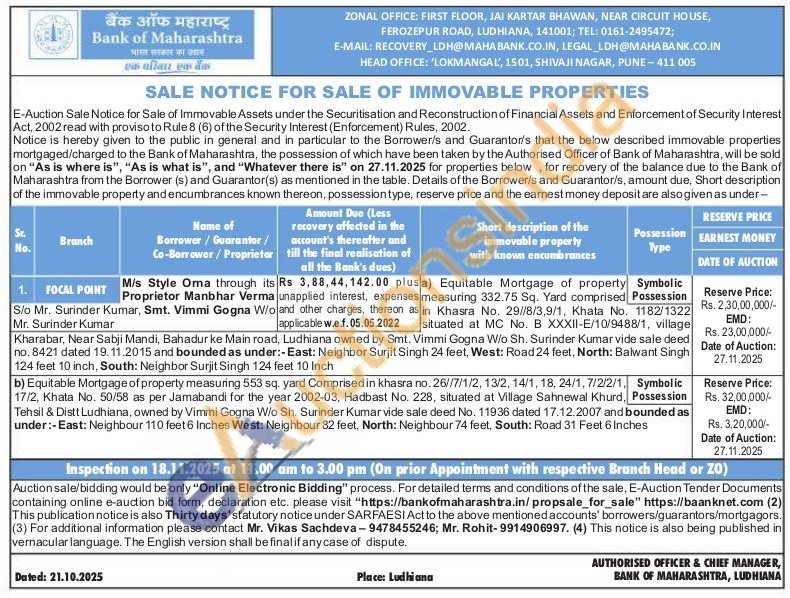 Equitable Mortgage of property measuring 332.75 Sq. Yard comprised lin Khasra No. 29//8/3,9/1, Khata No. 1182/1322 situated at MC No. B XXXII-E/10/9488/1, village Kharabar, Near Sabji Mandi, Bahadur ke Main road, Ludhiana owned by Smt. Vimmi Gogna W/o Sh. Surinder Kumar vide sale deed no. 8421 dated 19.11.2015 and bounded as under:- East: Neighbor Surjit Singh 24 feet, West: Road 24 feet, North: Balwant Singh 124 feet 10 inch, South: Neighbor Surjit Singh 124 feet 10 Inch