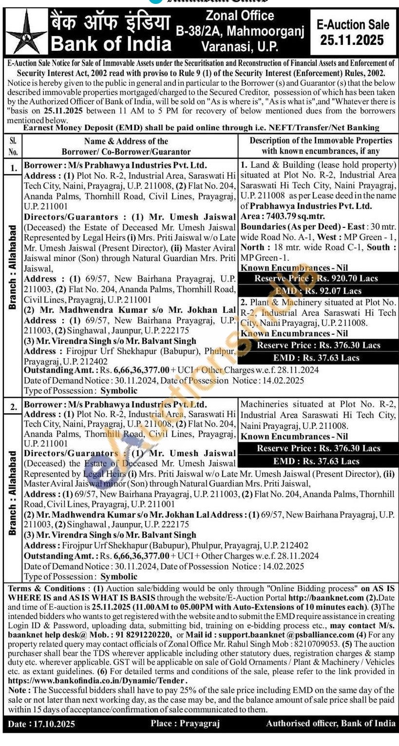 Machineries situated at Plot No. R-2, Industrial Area Saraswati Hi Tech City, Naini Prayagraj, U.P. 211008.