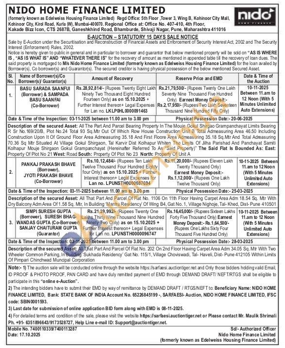 Description of the secured Asset: All That Part And Parcel Of Flat No. 1106 On 11th Floor Having Carpet Area Adm 18.54 Sq. Mtr With Dry Balcony Adm Area Of 1.58 Sq. Mtr. In Building "Mantra Residency Of Wing B4, Gat No. 1, Village Nighoje. Tal- Khed, Dist-Pune 410501