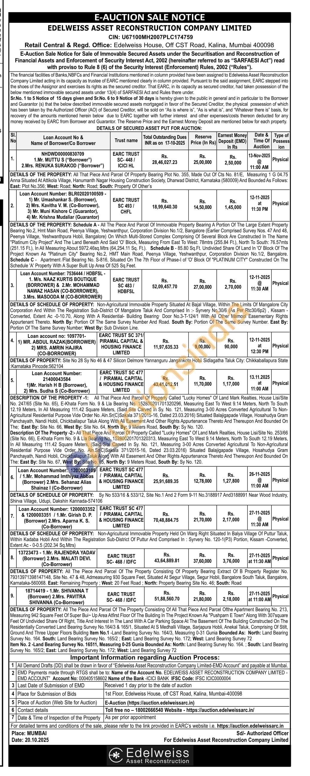 DESCRIPTION OF THE PROPERTY -1: All That Piece And Parcel Of Property Called "Lucky Homes" Of Land Mark Realties, House Lisi/Site No. 247/65 (Site No. 65), E-Khata Form No. 9 & Lla Bearing No. 152800201701320296, Measuring East To West 9.14 Meters, North To South 12.19 Meters, In All Measuring 111.42 Square Meters, (Said Site Carved In Sy. No. 121, Measuring 3-00 Acres Converted Agricultural To Non-Agricultural Residential Purpose Vide Order No. Aln.Sr(C)Sakala 371/2015-16, Dated 23.03.2016) Situated Balajigapade Village, Hosahudya Gram Panchayath, Nandi Hobli, Chickballapur Taluk Along With All Easement And Other Rights Appurtenance Thereto And Thereupon And Bounded On The; East By: Site No. 66, West By: Site No. 64, North By: 9 Meters Road, South By: Sy No. 120. Description Of The Property -2:- All That Piece And Parcel Of Property Called "Lucky Homes" Of Land Mark Realties, House Lisi/Site No. 253/66 (Site No. 66), E-Khata Form No. 9 & Lla Bearing No. 152800201701320313, Measuring East To West 9.14 Meters, North To South 12.19 Meters, In All Measuring 111.42 Square Meters, (Said Site Carved In Sy. No. 121, Measuring 3-00 Acres Converted Agricultural To Non-Agricultural Residential Purpose Vide Order No. Aln.Sr(C)Sakala 371/2015-16, Dated 23.03.2016) Situated Balajigapade Village, Hosahudya Gram Panchayath, Nandi Hobli, Chickballapur Taluk Along With All Easement And Other Rights Appurtenance Thereto And Thereupon And Bounded On The: East By: Site No. 67, West By: Site No. 65, North By: 9 Meters Road, South By: Sy No. 120.