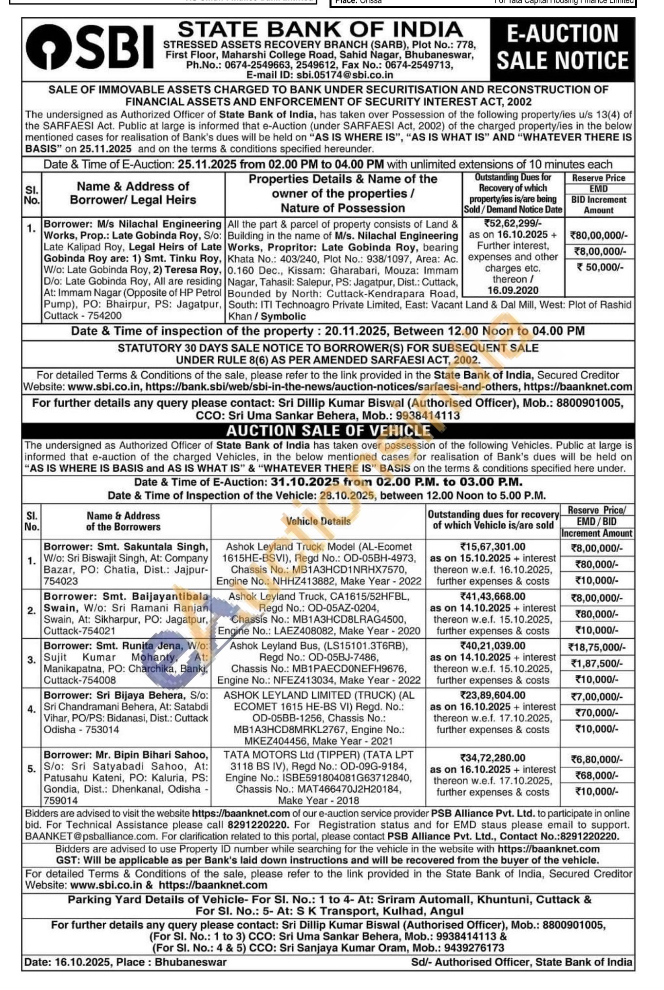 Sri Dillip Kumar Biswal (Authorised Officer), Mob.: 8800901005, (For Sl. No.: 1 to 3) CCO: Sri Uma Sankar Behera, Mob.: 9938414113 &