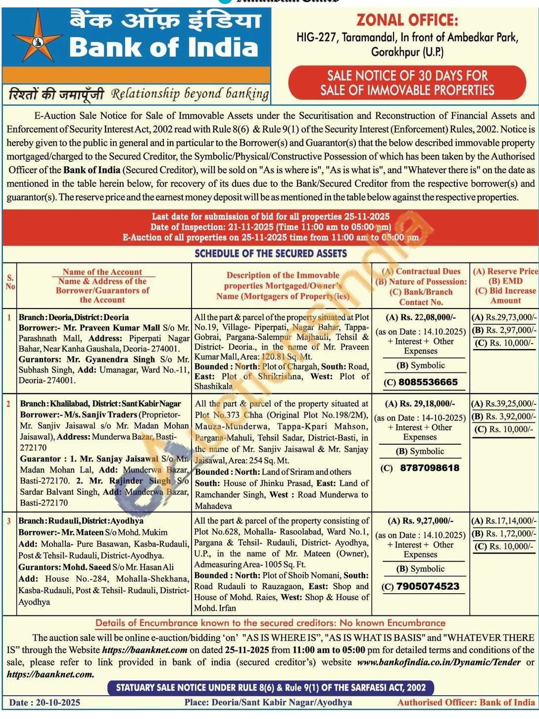All the part & parcel of the property situated at Plot No.19, Village- Piperpati, Nagar Bahar, Tappa-Gobrai, Pargana-Salempur Majhauli, Tehsil & District- Deoria., in the name of Mr. Praveen Kumar Mall, Area: 120.81 Sq. Mt. Bounded: North: Plot of Chargah, South: Road, East: Plot of Shrikrishna, West: Plot of Shashikala