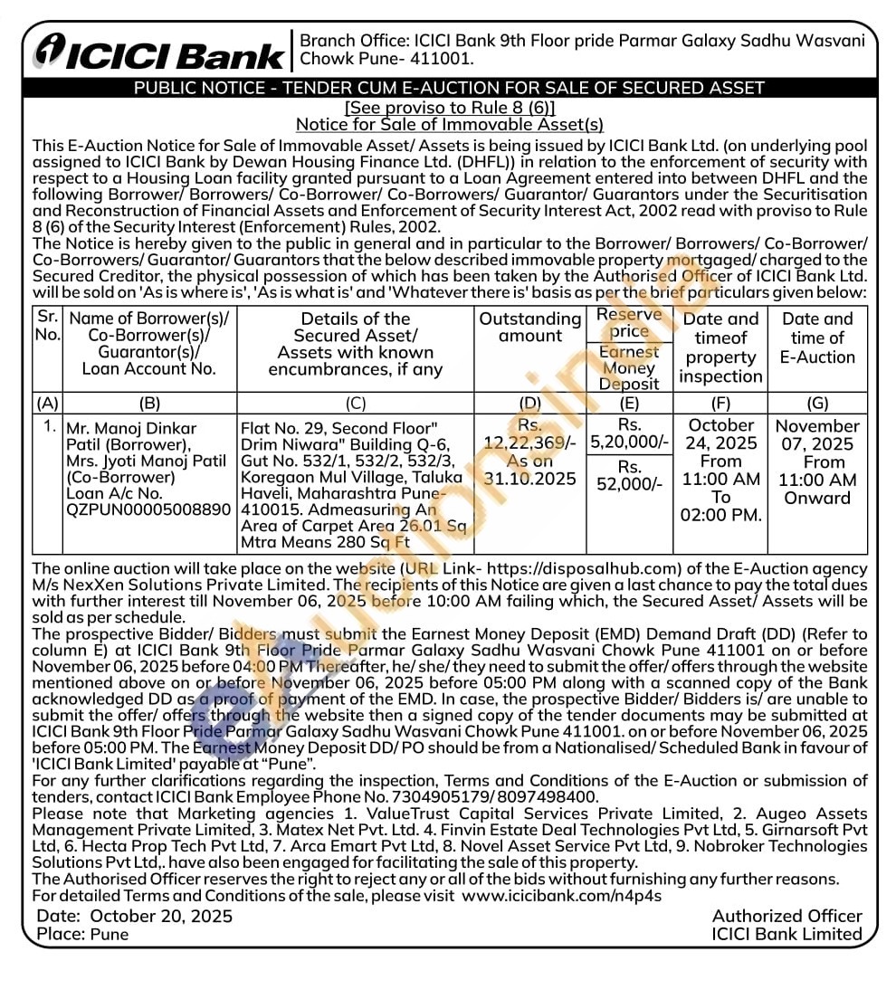 Flat No. 29, Second Floor" Drim Niwara" Building Q-6, Gut No. 532/1, 532/2, 532/3, Koregaon Mul Village, Taluka Haveli, Maharashtra Pune-410015. Admeasuring An Area of Carpet Area 26.01 Sq Mtra Means 280 Sq Ft