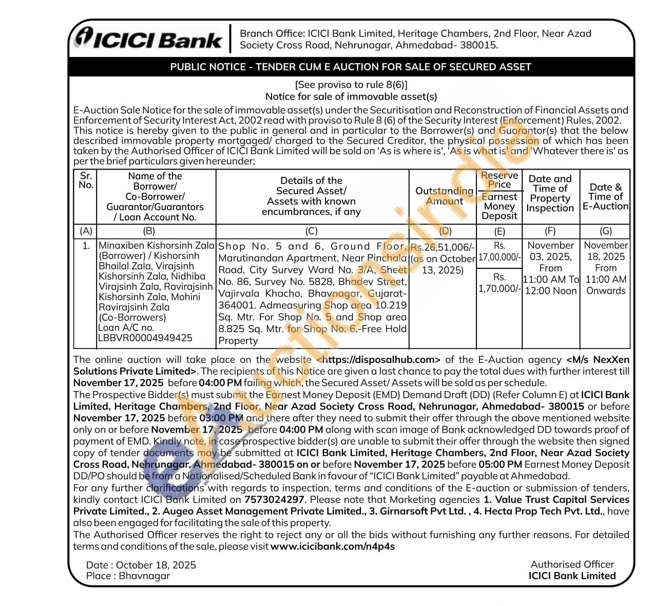 Shop No. 5 and 6, Ground Floor, Marutinandan Apartment, Near Pinchala Road, City Survey Ward No. 3/A, Sheet No. 86, Survey No. 5828, Bhadev Street, Vajirvala Khacho, Bhavnagar, Gujarat-364001. Admeasuring Shop area 10.219 Sq. Mtr. For Shop No. 5 and Shop area 8.825 Sq. Mtr. for Shop No. 6.-Free Hold Property
