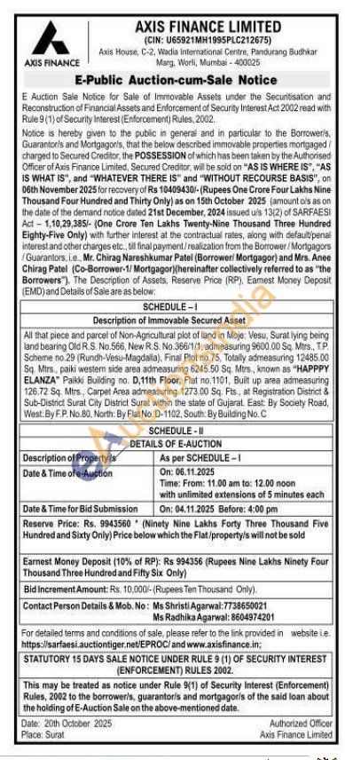 All that piece and parcel of Non-Agricultural plot of land in Moje: Vesu, Surat lying being land bearing Old R.S. No.566, New R.S. No.366/1/1, admeasuring 9600.00 Sq. Mtrs., TP. Scheme no.29 (Rundh-Vesu-Magdalla), Final Plot no.75, Totally admeasuring 12485.00 Sq. Mtrs, paiki westem side area admeasuring 6245.50 Sq. Mtrs, known as "HAPPPY ELANZA" Paikki Building no. D,11th Floor, Flat no.1101, Built up area admeasuring 126.72 Sq. Mtrs, Carpet Area admeasuring 1273.00 Sq. Fts., at Registration District & Sub-District Surat City District Surat within the state of Gujarat. East: By Society Road, West: By F.P. No.80, North: By Flat No. D-1102, South: By Building No. C