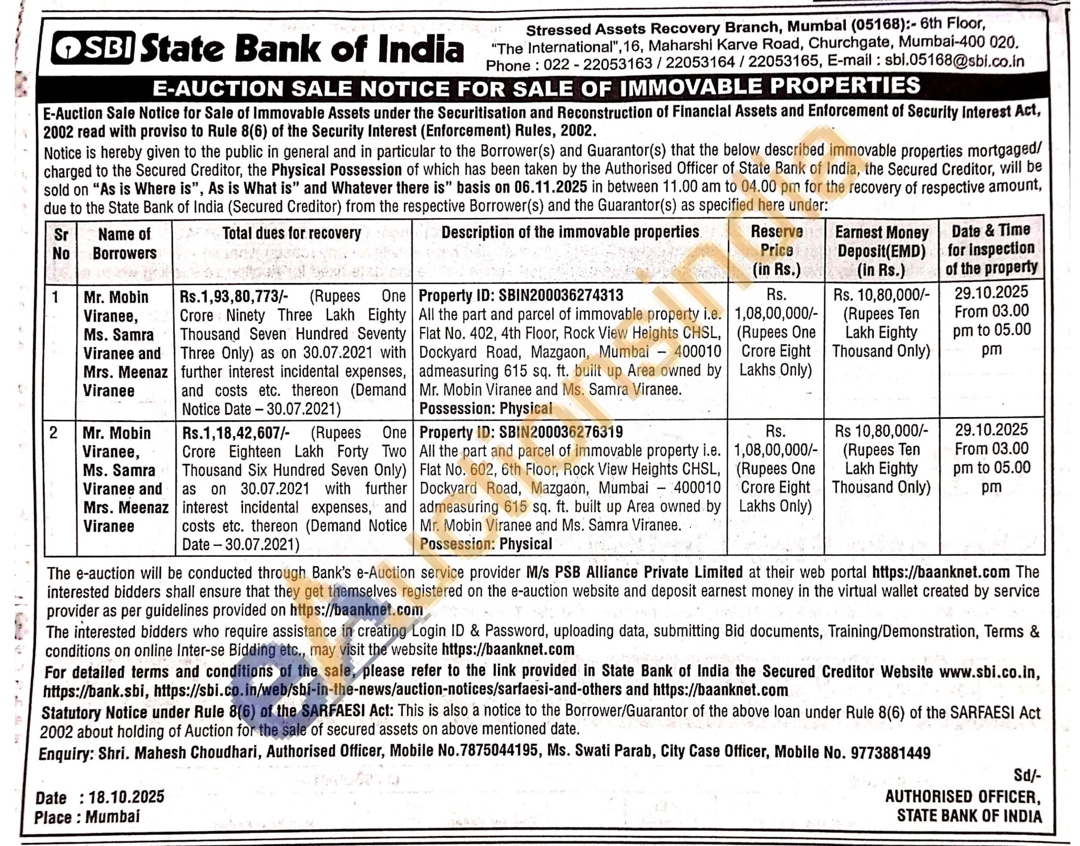 All the part and parcel of immovable property i.e. Flat No. 402, 4th Floor, Rock View Heights CHSL, Dockyard Road, Mazgaon, Mumbai admeasuring 615 sq. ft. built up Area owned by Mr. Mobin Viranee and Ms. Samra Viranee. Possession: Physical