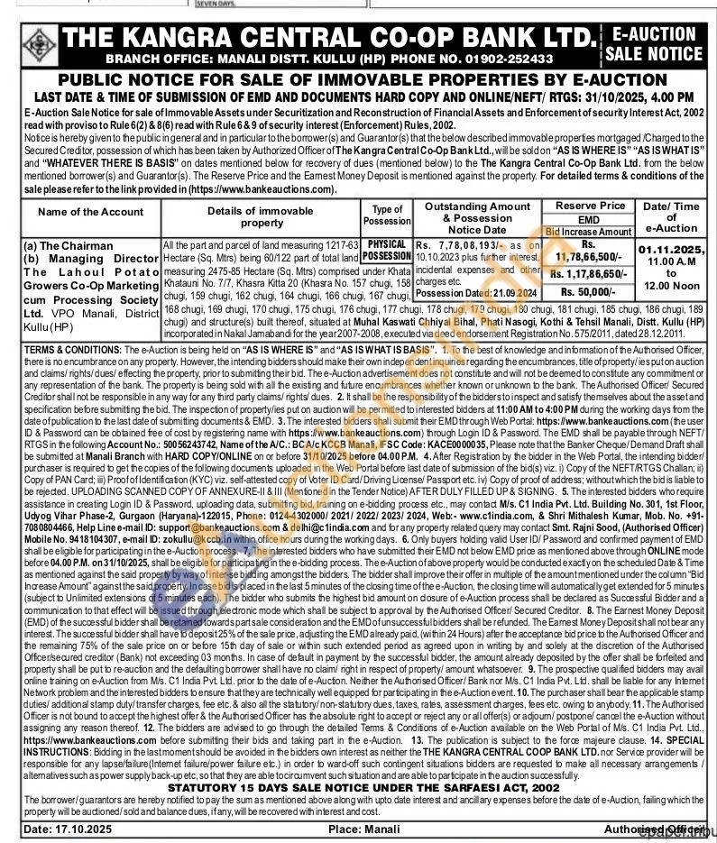 All the part and parcel of land measuring 1217-63 measuring 2475-85 Hectare (Sq. Mtrs) comprised under Khata Khatauni No. 7/7, Khasra Kitta 20 (Khasra No. 157 chugi, 158 chugi, 159 chugi, 162 chugi, 164 chugi, 166 chugi, 167 chugi 168 chugi, 169 chugi, 170 chugi, 175 chugi, 176 chugi, 177 chugi, 178 chugi, 179 chugi, 180 chugi, 181 chugi, 185 chugi, 186 chugi, 189 chugi) and structure(s) built thereof, situated at Muhal Kaswati Chhiyal Bihal, Phati Nasogi, Kothi & Tehsil Manali, Distt. Kullu (HP) incorporated in Nakal Jamabandi for the year 2007-2008,