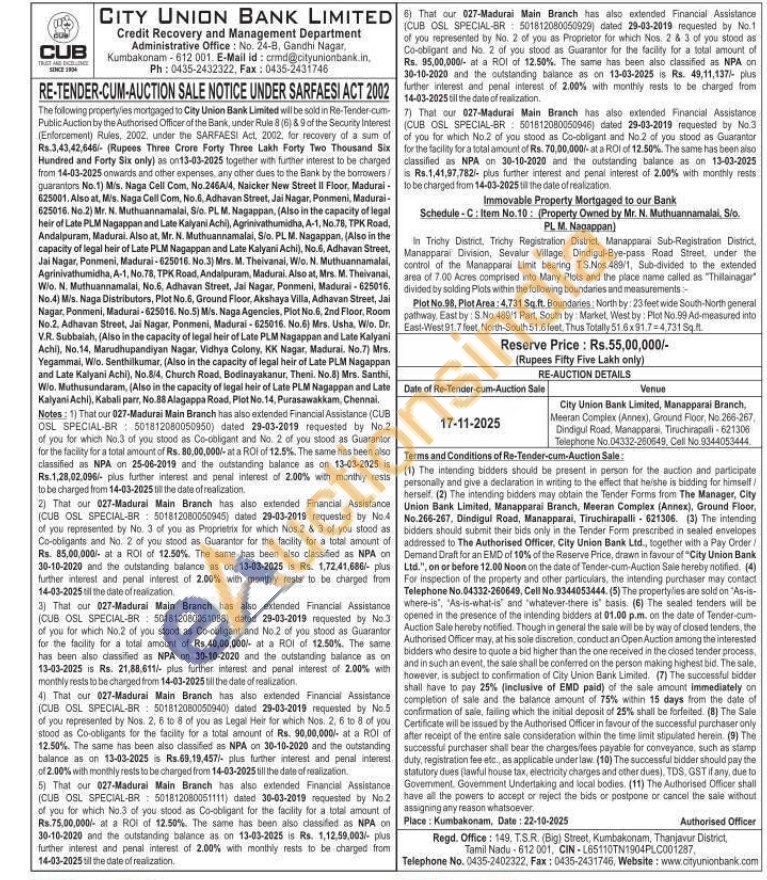 In Trichy District, Trichy Registration District, Manapparai Sub-Registration District, Manapparal Division, Sevalur Village, Dindigul-Bye-pass Road Street, under the control of the Manapparai Limit bearing TS.Nos. 489/1, Sub-divided to the extended area of 7.00 Acres comprised into Many Piols and the place name called as "Thilainagar" divided by solding Plots within the following boundaries and measurements:- Plot No.98, Plot Area: 4,731 Sq.ft. Boundaries, North by: 23 feet wide South-North general pathway, East by: S.No. 489/1 Part, South by Market, West by: Plot No.99 Ad-measured into East-West 91.7 feet, North-South 51.5 feet. Thus Totally 51.6x91.7=4,731 Sq.ft.