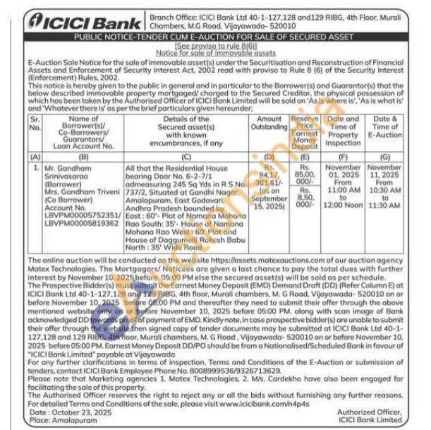 All that the Residential House bearing Door No. 6-2-7/1 odmeasuring 245 Sq Yds in RS No. 737/2, Situated at Gandhi Nagar, Amalapuram, East Godavari, Andhra Pradesh bounded by East: 60-Plot of Namana Mahana Rao South: 35- House of Namana Mohana Rao West: 60' Plot and House of Daggumelli Rakesh Babu North: 35' Wide Road