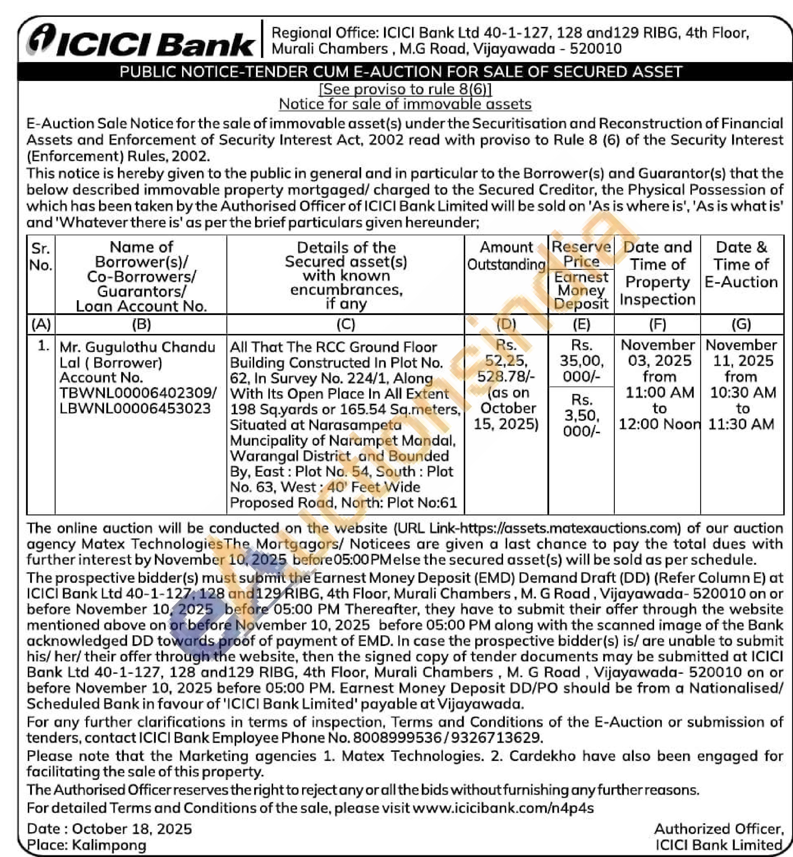 All That The RCC Ground Floor Building Constructed In Plot No. 62, In Survey No. 224/1, Along With Its Open Place In All Extent 198 Sq.yards or 165.54 Sq.meters, Situated at Narasampeta Muncipality of Narampet Mandal, Warangal District and Bounded By, East: Plot No. 54, South: Plot No. 63, West: 40' Feet Wide Proposed Road, North: Plot No:61