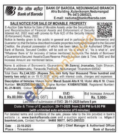 Description of Vehicles: Makers Name: Maruti Suzuki Alto K 10. Model: Alto K 10, Chasis Number: MAJEZDEIS00196327, Engine Number: K10BN1879588, Registered Number: KL-21-M-605 Colour Metallic Firebrick