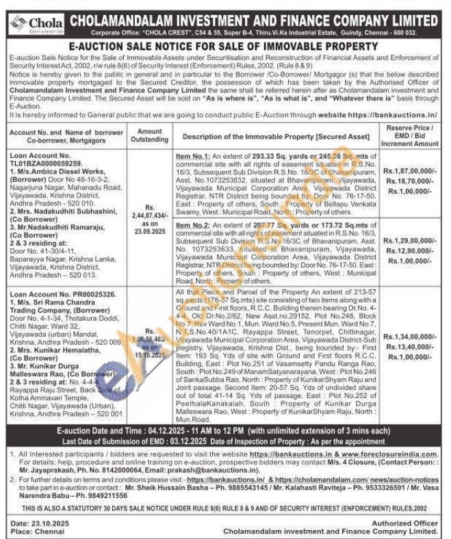 All that Piece and Parcel of the Property An extent of 213-57 sq yards (178-57 Sq.mts) site consisting of two items along with a Ground and First floors, R.C.C. Building therein bearing Dr.No. 4-4-4. Old Dr.No. 2/62, New Asst.no.29152. Plot No.248, Block No.7. Rev Ward No. 1, Mun. Ward No.5, Present Mun. Ward No.7, N.T.S.No. 40/1A1C, Rayappa Street, Tenorpet, Chittinagar, Vijayawada Municipal Corporation Area, Vijayawada District-Sub Registry, Vijayawada, Krishna Dist., being bounded by: First Item: 193 Sq. Yds of site with Ground and First floors R.C.C. Building, East: Plot No.251 of Vasamsetty Pandu Ranga Rao, South: Plot No.249 of Manam Satyanarayana, West: Plot No.246 of SankaSubba Rao, North: Property of KunikarShyam Raju and Joint passage. Second Item: 20-57 Sq. Yds of undivided share out of total 41-14 Sq. Yds of passage, East Plot No.252 of Peethalakanakalah, South Property of Kunikar Durga Malleswara Rao, West: Property of KunikarShyam Raju, North Mun. Road