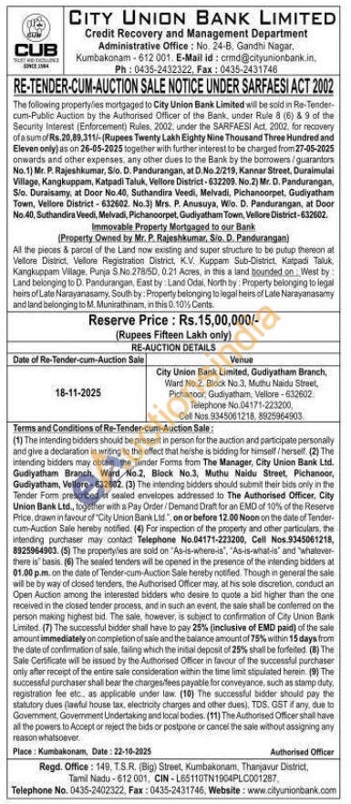 All the pieces & parcel of the Land now existing and super structure to be putup thereon at Vellore District, Vellore Registration District, KV. Kuppam Sub-District, Katpadi Taluk Kangkuppam Village, Punja S.No. 278/50, 0.21 Acres, in this a land bounded on West by: Land belonging to D. Pandurangan, East by Land Odal, North by: Property belonging to legal heirs of Late Narayanasamy, South by: Property belonging to legal heirs of Late Narayanasamy and land belonging to M. Munirathinam, in this 0.10% Cents.
