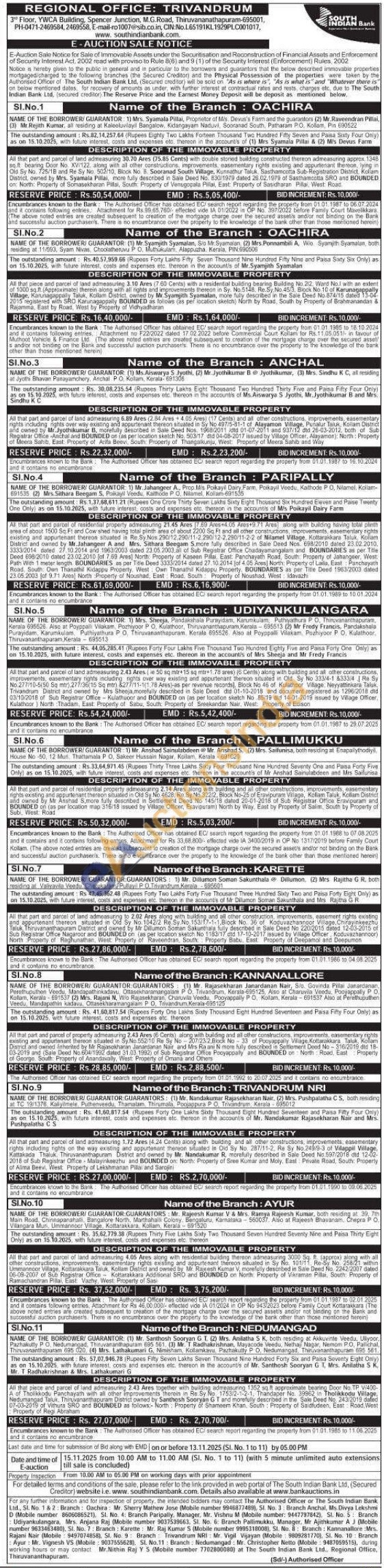 All that part and parcel of land admeasuring 2.43 Ares (le 50 sq mir+15 sq mir+1.78 ares) (6 Cents) along with building and all other constructions, improvements, easementary nights including nights over way existing and appurtenant thereon situated in Old Sy No 333/4-1 8333/4 Re Sy No.277/10-5150 Sq mtr) 277:36(15 Sq mtr) 8277/11-1(1.78 Ares)-as per revenue records, Block No 46 of Kulathoor Village, Neyyattinkara Taluk Trivandrum District and owned by Mrs Sheeja, morefully described in Sale Deed did 01-10-2018 and document registered as 1296/2018 did 03/10/2018 of Sub Registrar Office Kulathuoor and BOUNDED on (as per location sketch No 85/19 did 14-01-2019 issued by Vilage Officer, Kulathoor) North Thadam, East Property of Sabu, South: Property of Sreekandan Nair, West: Property of Edison