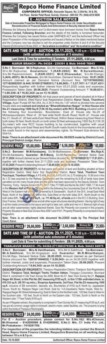 All that plece and parcel of land situated at In Karur Registration District, West Karur Sub Registration District, Karur Taluk, Thanthoni Village, Ayan Punjal SF.No.554, Ac.3.34 in this Ac. 1.67 which is divided into several house sites and named and styled as "Bharathidashan Nagar" in this House site No.21 measuring 1500 Sq.ft (139.35 Sq.meter) with RCC Building situated within the following four boundaries: Boundaries: East of: House site No.20 of Mohanasundaram; West of 20 feet wide North South Road: North of House site No. 31; South of: 20 feet wide East West Road: Within these measuring East West on both sides 30 feet, North South on both sides 50 feet admeasuring 1500 Sq.ft (139.35 Sq.meter) with new RCC house building to be constructed, together with usual pathway rights over East West and North South roads found in the boundaries and all the roads found in the layout and easementary rights. Its Present Sub-division No. 554/1A
