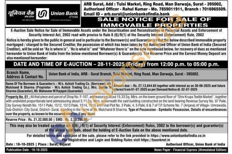 Property No. 01: 15.33 Sq. Mtrs. on the lower ground floor of "Shiv Krupa Textile Market", together with undivided proportionate land admeasuring about 5.11 Sq. Mtrs. underneath the said building constructed on the land bearing Revenue Survey No. 97 Paiki, City Survey Nondh No. 1511 Paiki, 1512, 1513 Paiki, 1514, 1515 and Final Plot No. 3 Paiki, 4, 5 Paiki, 6 & 7 of T.P. Scheme No. 7 (Anjana) of Village- Umrawada, Sub-District-City Surat, District- Surat, standing in the name of Mr. Mulchand B Sharma. Type of Possession - Symbolic Possession, Details of encumbrances over the property, as known to the secured creditor, if any: None