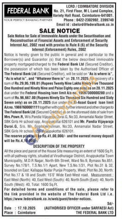 All the piece and parcel of the House Site measuring an extent of 1600 Sq.Ft. with all pathway rights, situated at Virudhunagar District, Aruppukottai Town Municipality, M.D.R Nagar, North 6th Street, Ward No.9, Bymass No.851. Survey No.178/1, T.S.No.1/1 Apart, New T.S.No.1/31, Plot No.31 & 32. bounded on East: Kallappa Nadar Punjai Property, West: Plot No.30, North: Plot No.17 & 18 and South: 15'0' Wide East-West road. Measurement: East West (North): 40, East West (South): 40, North South (East): 40, North South (West): 40, Total: 1600 Sq. Ft.