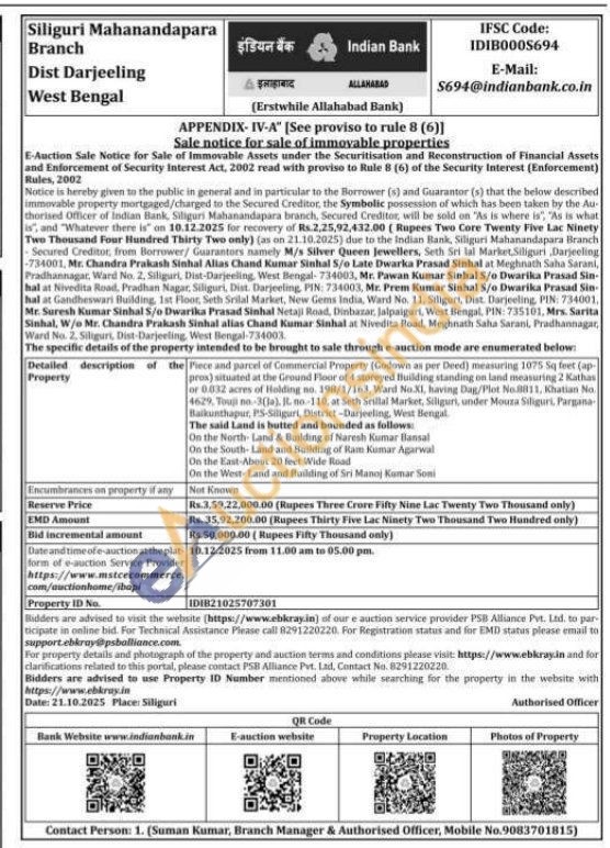 Piece and parcel of Commercial Property (Godown as per Deed) measuring 1075 5q feet (ap prus) situated at the Ground Flour of 4 storeyed Building standing on land measuring 2 Kathas of 0.032 acres of Holding no. 198/1/163, Ward No.XI, having Dag/Plot No.811, Khatian No. 4629, Tous no-3(Ja), L. no-110, at Seth Srillal Market, Siliguri, under Mouza Siliguri, Pargana Baikunthapur, PS-Siliguri, District-Darjeeling, West Bengal