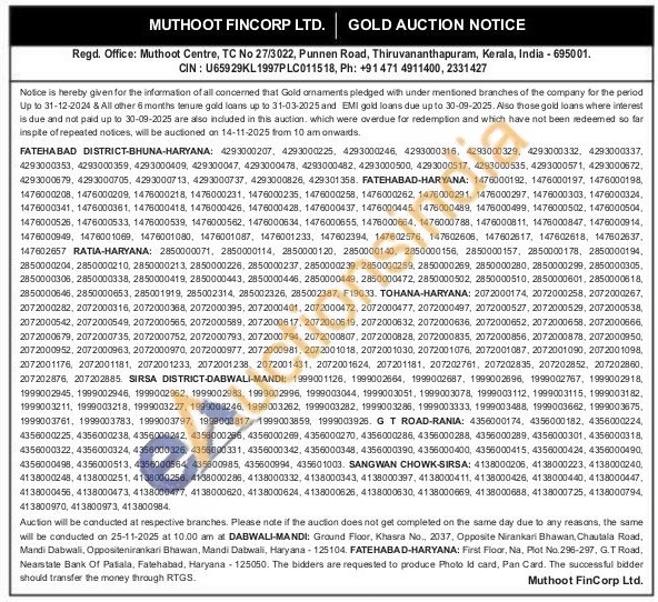 Muthoot Fincorp Ltd Gold Auctions Auction in Thiruvananthapuram