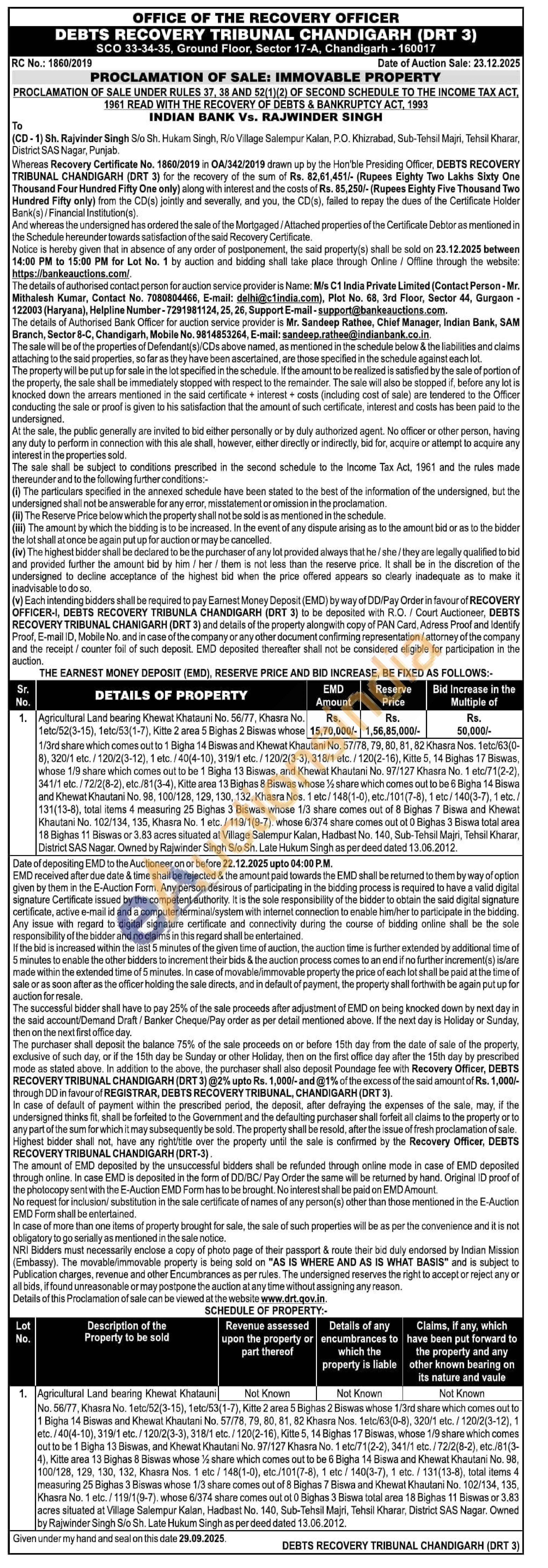 1/3rd share which comes out to 1 Bigha 14 Biswas and Khewat Khautani No. 57/78, 79, 80, 81, 82 Khasra Nos. 1etc/63(0-8), 320/1 etc./120/2(3-12), 1 etc./40(4-10), 319/1 etc./120/2(3-3), 318/1 etc./120(2-16), Kitte 5, 14 Bighas 17 Biswas, whose 1/9 share which comes out to be 1 Bigha 13 Biswas, and Khewat Khautani No. 97/127 Khasra No. 1 etc/71(2-2), 341/1 etc./72/2(8-2), etc./81(3-4), Kitte area 13 Bighas 8 Biswas whose share which comes out to be 6 Bigha 14 Biswa and Khewat Khautani No. 98, 100/128, 129, 130, 132, Khasra Nos. 1 etc/148(1-0), etc./101(7-8), 1 etc/140(3-7), 1 etc./131(13-8), total items 4 measuring 25 Bighas 3 Biswas whose 1/3 share comes out of 8 Bighas 7 Biswa and Khewat Khautani No. 102/134, 135, Khasra No. 1 etc./119/1(9-7). whose 6/374 share comes out ot 0 Bighas 3 Biswa total area 18 Bighas 11 Biswas or 3.83 acres situated at Village Salempur Kalan, Hadbast No. 140, Sub-Tehsil Majri, Tehsil Kharar, District SAS Nagar. Owned by Rajwinder Singh S/o Sh. Late Hukum Singh as per deed dated 13.06.2012