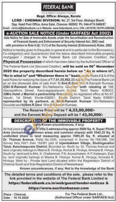 All that piece and parcel of Villa 2 admeasuring approx 5600 Sq. ft. Super Plinth Area (inclusive of common areas and common shares) with 3542.25 Sq. ft undivided share in land measuring approx 7085.25 Sq. ft. situated at Dr. Thomas Avenue, Patta No.3355, comprised in Survey No. 164/288, Old Survey Nos. 164/1 then 164/B1 part of Injambakkam Village, Sholinganallur Taluk, Kancheepuram District. Bounded on: North by Dr. Thomas Avenue and land originally belongs to Meena B. Hinduja, Komal B. Hinduja, Amreeta B. Hinuja, South by land sold to Mrs. K. Chellammal, P.N. Arunachalam, K.P. Kailasam, East by: land originally belongs to Meena B. Hinduja, Komal B. Hinduja. Amreeta B. Hinduja, West by: Private land Land situated within the Registration District of Chennai South and Sub-Registration District of Neelankarai