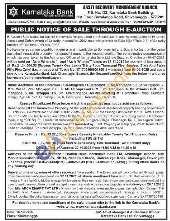 All that part and parcel of Residential property bearing Assessment KH No.222, E-Swathu No. 151200105100120085, Sy. No. 29/2 measuring East-West: 192.30 Mtrs X North-South: 17 Mtr and totally measuring 3269.10 Sq Mtr. Or 35,175.51 Sq.ft. Having a building constructed therein measuring 1950 Sq. Ft., situated at Haronahalli Road, Sunigere Village, Channagiri Taluk, Davangere District, Karnataka. Davangere District, Karnataka and bounded by: East: Property of Manjappa, West: Road, North: Land of Veerappa Sio Shivalingappa, South: House of Byrappa &his vacant site.