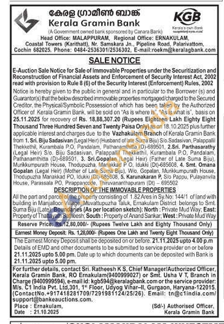 All the part and parcel of the property consisting of 1.82 Ares in Sy No: 144/1 of land with building in Manjalloor Village, Muvattupuzha Taluk, Emakulam District belongs to Sml. Suma Biju (Late), Boundaries (As per location sketch): North: Private Mud Way, East: Property of Thattayath Satheesh, South: Property of Anand Sankar; West: Private Mud Way