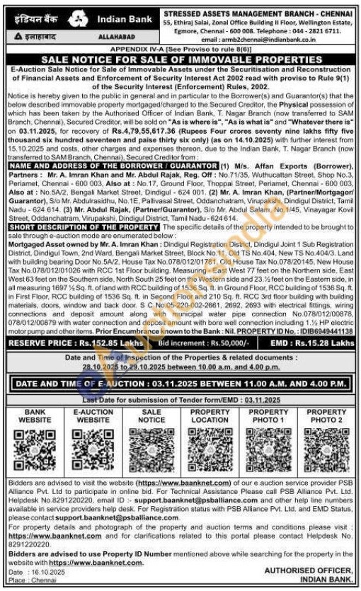 sale through e-auction mode are enumerated below: Mortgaged Asset owned by Mr. A. Imran Khan: Dindigul Registration District, Dindigul Joint 1 Sub Registration District, Dindigul Town, 2nd Ward, Bengali Market Street, Block No. 11, Old TS No. 404, New TS No. 404/3. Land with building bearing Door No.5A/2, House Tax No. 078/012/01781, Old House Tax No. 078/20145, New House Tax No.078/012/01026 with RCC 1st Floor building. Measuring-East West 77 feet on the Northern side, East West 63 feet on the Southern side, North South 25 feet on the Western side and 23.1/2 feet on the Eastern side, in all measuring 1697 % Sq. ft. of land with RCC building of 1536 Sq. ft. in Ground Floor, RCC building of 1536 Sq. ft. in First Floor, RCC building of 1536 Sq. ft. in Second Floor and 210 Sq. ft. RCC 3rd floor building with building materialis, doors, window and back door. SC No.05-220-002-2661, 2692, 2693 with electrical fittings, wiring connections and deposit amount along with municipal water pipe connection No.078/012/00878, 078/012/00879 with water connection and deposit amount with bore well connection including 1 1/2 HP electric motor pump and other items. Prior Encumbrance known to the Bank: Nil. PROPERTY ID No.: IDIB6949441138