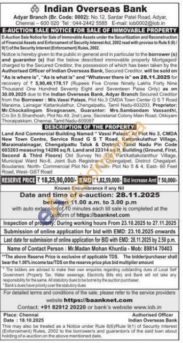 Land And Commercial Building Named Vassi Palaze" At Plot No 3, CMDA New Town Centre, Service Road GST Road, Kattankulathur Village, Maraimalainagar, Chengalpattu Taluk & District, Tamil Nadu Pin Code 603203 measuring 14286 sq.ft. Land and 22314 sq.ft. Building (Ground, First, Second & Third Floors) Old Survey No 336 Part/kattakolanthur Village, Municipal Ward No-8, Joint Sub Registrar-Il Chengalpet, District Chegalpet Boudaries: North Commercial Plot No 2. South Plot No 5 & 4. East-60 Feet Road, West-GST Road