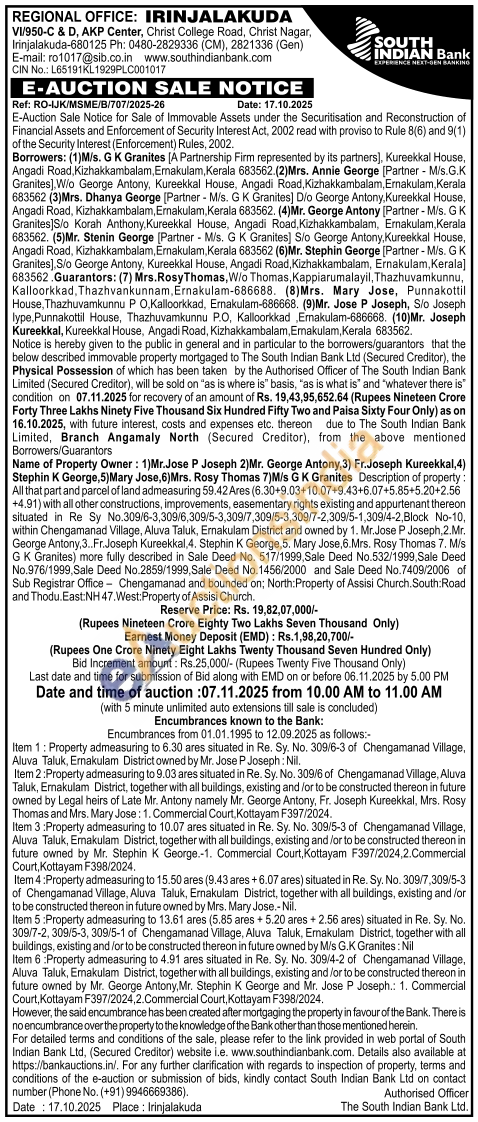 Description of property: All that part and parcel of land admeasuring 59.42 Ares (6.30+9.03+10.07+9.43+6.07+5.85+5.20+2.56 +4.91) with all other constructions, improvements, easementary rights existing and appurtenant thereon situated in Re Sy No.309/6-3,309/6,309/5-3,309/7,309/5-3,309/7-2,309/5-1,309/4-2, Block No-10, within Chengamanad Village, Aluva Taluk, Ernakulam District and owned by 1. Mr.Jose P Joseph, 2.Mr. George Antony, 3.. Fr. Joseph Kureekkal, 4. Stephin K George, 5. Mary Jose, 6. Mrs. Rosy Thomas 7. M/s GK Granites) more fully described in Sale Deed No. 517/1999, Sale Deed No.532/1999, Sale Deed No.976/1999, Sale Deed No.2859/1999, Sale Deed No.1456/2000 and Sale Deed No.7409/2006 of Sub Registrar Office Chengamanad and bounded on; North: Property of Assisi Church. South: Road and Thodu. East:NH 47. West: Property of Assisi Church