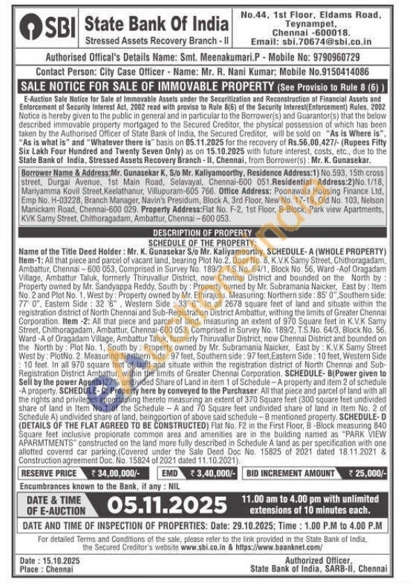Item-1: All that piece and parcel of vacant land, bearing Plot No.2, Door No. 8. K.V.K Samy Street, Chithoragadam, Ambattur, Chennai-600 053, Comprised in Survey No. 189/2, T.S.No. 64/1, Block No. 56, Ward -Aof Oragadam Village, Ambattur Taluk, formerly Thiruvallur District, now Chennai District and bounded on the North by: Property owned by Mr. Sandyappa Reddy, South by: Property owned by Mr. Subramania Naicker, East by: Item No. 2 and Plot No. 1, West by: Property owned by Mr. Ethirajulu. Measuring: Northern side: 85' 0", Southern side: 77 0". Eastern Side: 32 6", Western Side: 33° 6". In all 2678 square feet of land and situate within the registration district of North Chennai and Sub-Registration District Ambattur, withing the limits of Greater Chennai Corporation. Item -2: All that piece and parcel of land, measuring an extent of 970 Square feet in K.V.K Samy Street, Chithoragadam, Ambattur, Chennai-600 053, Comprised in Survey No. 189/2, T.S.No. 64/3, Block No. 56. Ward -A of Oragadam Village, Ambattur Taluk, formerly Thiruvallur District, now Chennai District and bounded on the North by Plot No. 1, South by: Property owned by Mr. Subramania Naicker, East by: K.V.K Samy Street West by: Plot No. 2. Measuring Northern side: 97 feet, Southern side: 97 feet, Eastern Side: 10 feet, Western Side 10 feet. In all 970 square feet of land and situate within the registration district of North Chennai and Sub-Registration District Ambattur, within the limits of Greater Chennai Corporation, SCHEDULE- B(Power given to Sell by the power Agents)27% undivided Share of Land in item 1 of Schedule-A property and item 2 of schedule -A property, SCHEDULE-C: Property here by conveyed to the Purchaser: All that piece and parcel of land with all the rights and privileges appertaining thereto measuring an extent of 370 Square feet (300 square feet undivided share of land in Item No.1 of the Schedule A and 70 Square feet undivided share of land in Item No. 2 of Schedule A) undivided share of land, beingportion of above said schedule-B mentioned property. SCHEDULE-D (DETAILS OF THE FLAT AGREED TO BE CONSTRUCTED) Flat No. F2 in the First Floor, B-Block measuring 840 Square feet inclusive propionate common area and amenities are in the building named as "PARK VIEW APARMTMENTS" constructed on the land more fully described in Schedule A land as per specification with one allotted covered car parking. (Covered under the Sale Deed Doc No. 15825 of 2021 dated 18.11.2021 & Construction agreement Doc. No. 15824 of 2021 dated 11.10.2021).