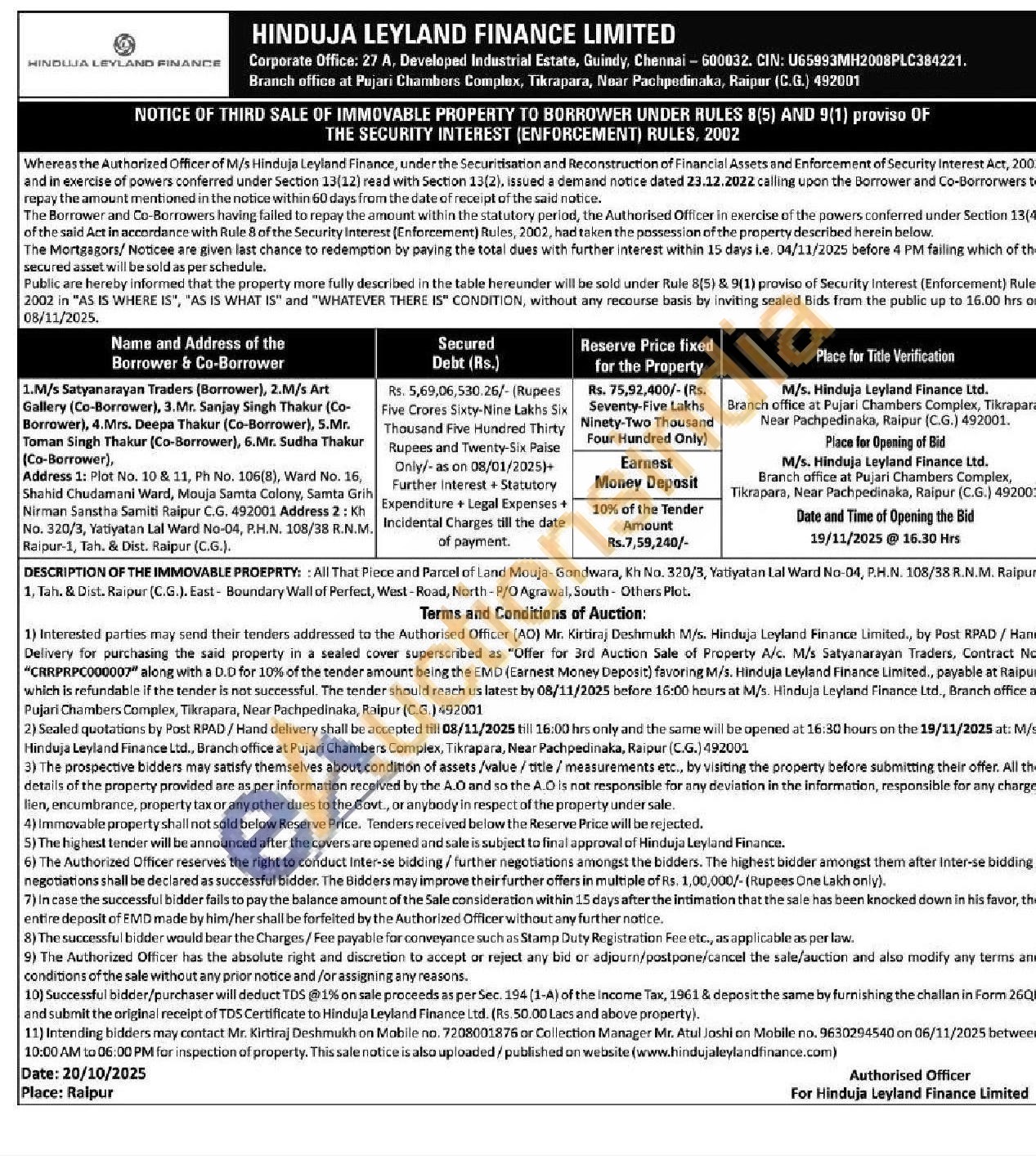 All That Piece and Parcel of Land Mouja-Gondwara, Kh No. 320/3, Yatiyatan Lal Ward No-04, P.H.N. 108/38 R.N.M. Raipur 1, Tah. & Dist. Raipur (C.G.). East- Boundary Wall of Perfect, West-Road, North-P/O Agrawal, South-Others Plot.